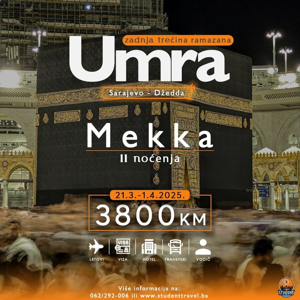 Okupljanje na sarajevskom aerodromu tri sata prije leta. Carinska i pasoška kontrola. Let za Džeddu je u 12:30h. Dolazak u 18:55h u Džeddu prema lokalnom vremenu. Nakon pasoške i carinske kontrole polazak prema Mekki. V ožnja do Mekke traje oko 2 sata. Kratko smještanje u hotel, a potom zajedničko obavljanje umre.